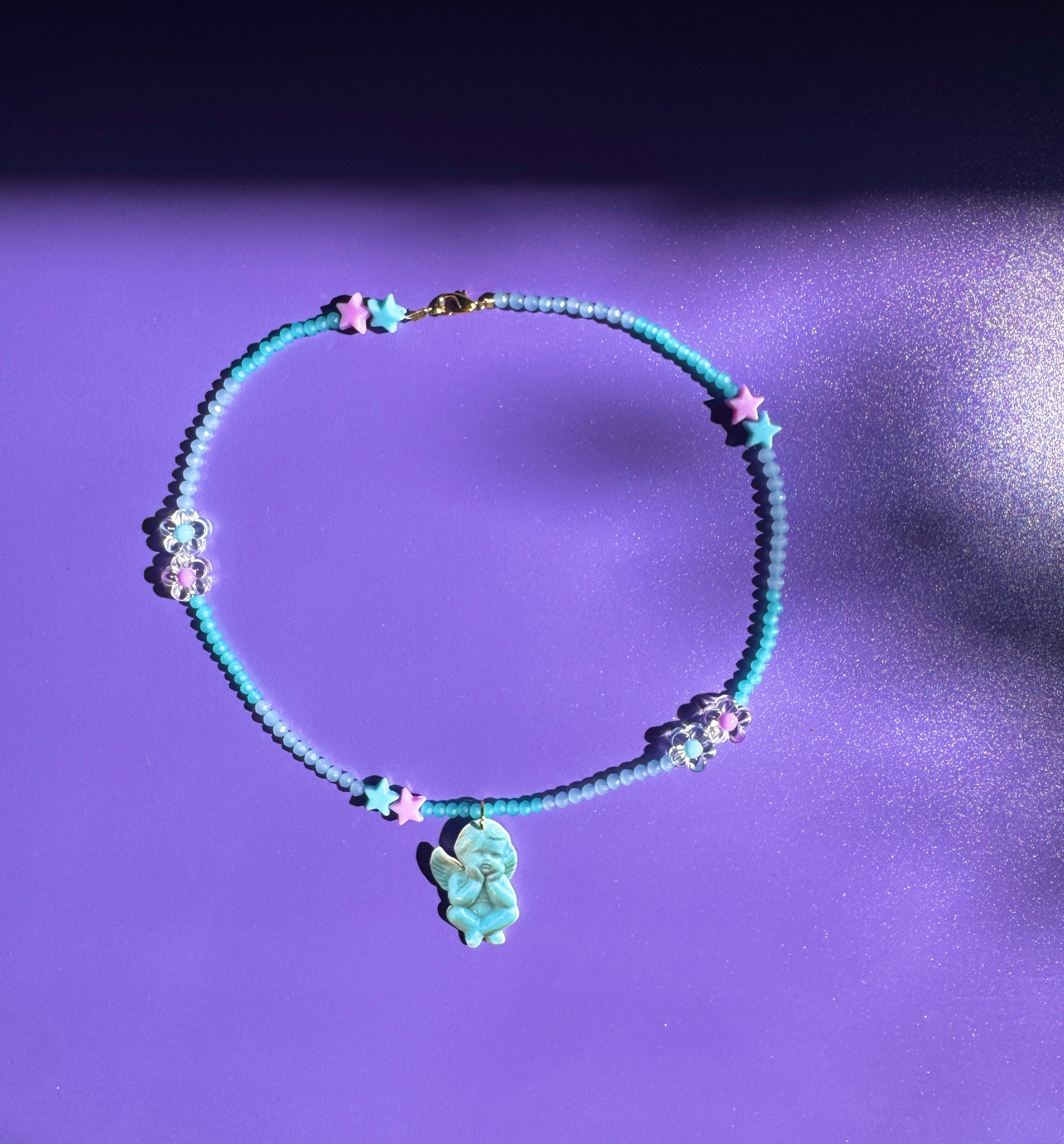 Elevate your style with the Angel Baby necklace, a celestial-inspired piece that blends soft hues and playful textures. This handmade necklace features a dreamy mix of aqua and baby blue seed beads, accented with pastel star charms and clear daisy-shaped flower beads with lavender and silver tones. The centerpiece is a delicate turquoise angel pendant, radiating protection and charm.