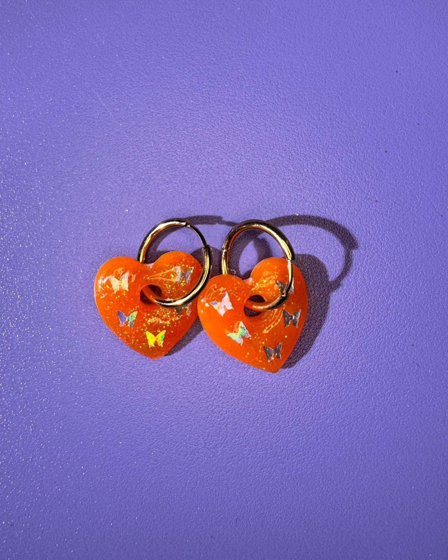 These Heart Charm Earrings feature neon orange iridescent butterflies delicately set on PVD gold huggie hoops. The vibrant iridescent butterflies adds a dynamic pop of color, while the durable PVD gold finish ensures lasting shine and resistance to wear. Perfect for adding a sophisticated yet playful touch to any outfit, these earrings combine expert craftsmanship with eye-catching design.